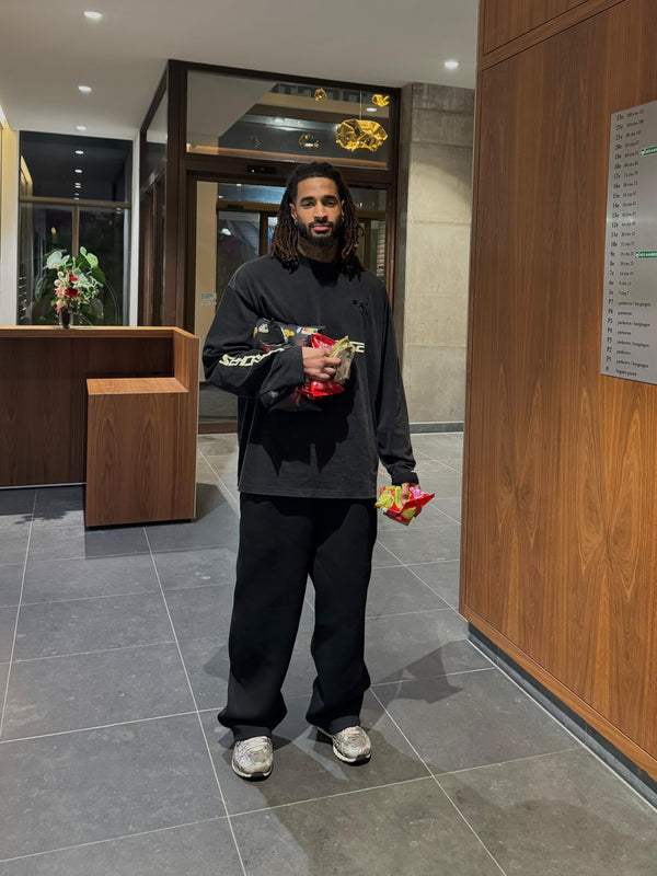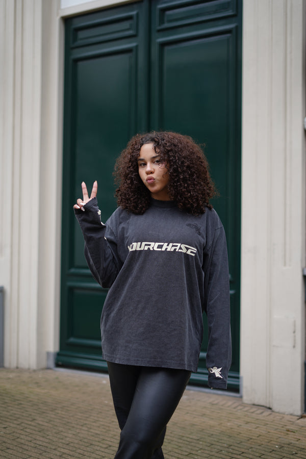 Heavyweight cotton longsleeve with a washed black finish.Designed with an oversized silhouette. Features YOURCHASE™ branding across the chest and sleeve.Embroidered Angel detail at the chest.Small embroidered “25” placed at the...