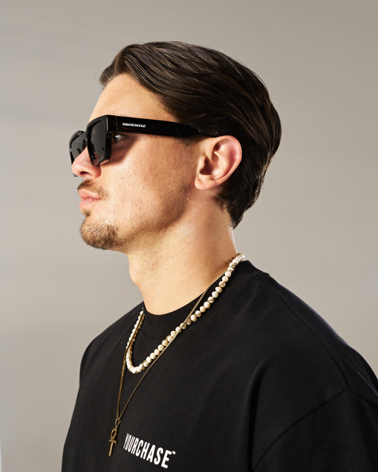 Made from high-quality polished acetate Thick black frame with deep Black lenses Oversized YOURCHASE logo on the temples 100% UV protection Comes with a premium acetate case with embossed YOURCHASE...